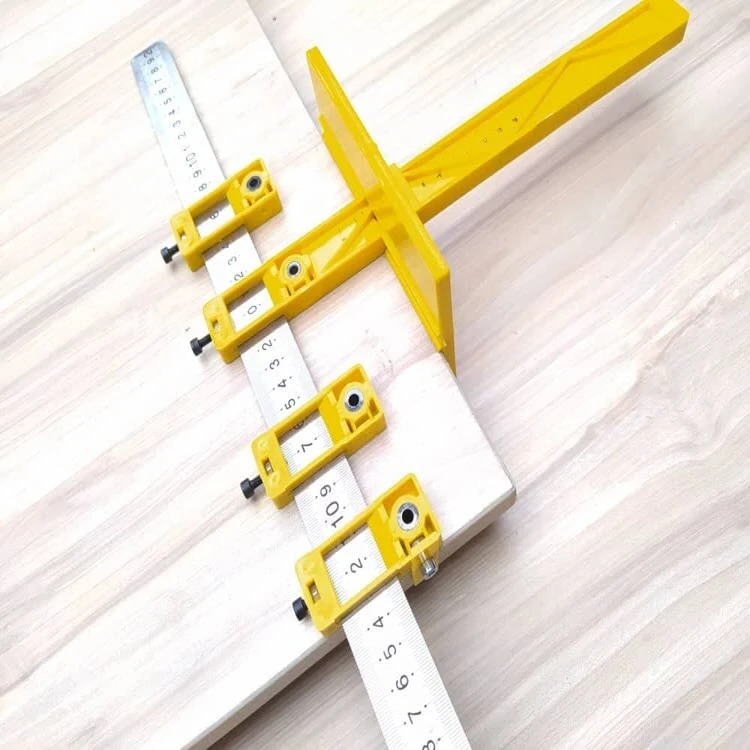 با گجت نصب دستگیره کشو و دراور میتوان اندازههای دقیق جای دستگیره را بر روی کمد، کابینت و کشو را در آورید. این شابلون جای دستگیره شامل یک عدد خط کش فلزی ، یک عدد پایه مستطیلی، چهار اهرم متحرک روی خط کش فلزی و یک خط کش پلاستیکی متحرک میباشد. جنس این شابلون پلاستیکی میباشد که با استفاده از ابزار الات به راحتی میتوانید جای دقیق دستگیره را مشخص نمایید.این مدل شابلون دستگیره قابلیت مشخص کردن جای سوراخ در درب کشوهایی به ارتفاع حداکثر 32 سانتیمتر میباشد. جنس ریل اصلی این مدل گجت نصب دستگیره از پلاستیک درجه یک میباشد و دارای یک خط کش فلزی است. این خط کش فلزی به سانتیمتر درجه بندی شده است و از دو قسمت صفر تا 15 سانتیمتری تشکیل شده است که میتوانید از دو طرف خط کش برای اندازه گیری تا 30 سانتیمتر استفاده کنید. در ادامه با مشخصات فنی شابلون سوراخ کاری دستگیره آشنا خواهید شد.